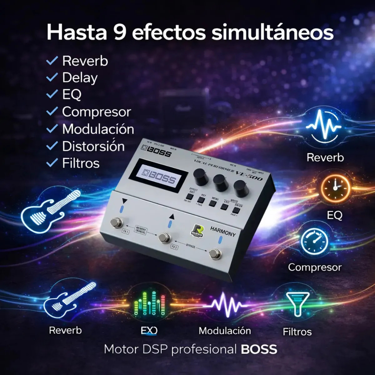 Este pedal cuenta con 24 efectos que te permitirán crear nuevos sonidos y elevar tu música. ¡Animate a explorar sonoridades diferentes!