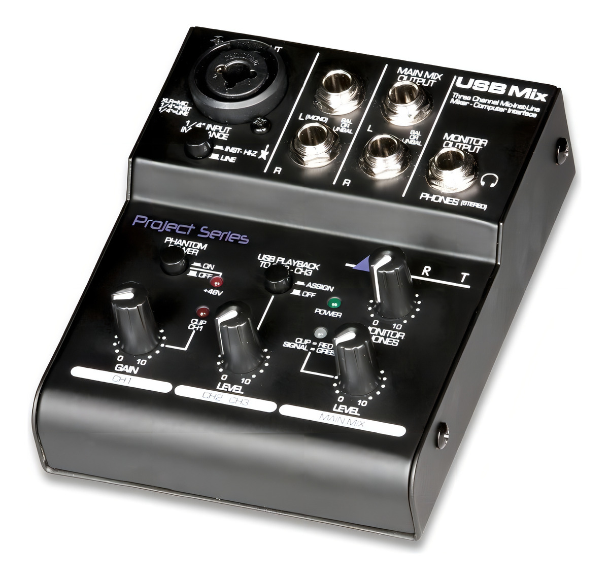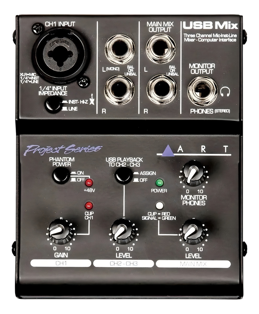 El ART USB Mix es un mezclador de 3 canales y una interfaz de audio USB de tamaño compacto, perfecto para estudios domésticos o móviles. Cuenta con una entrada de conector combinado XLR-1/4 “que puede soportar señales de micrófono, instrumento o línea, permitiéndote conectar tu micrófono o instrumento favorito. Esta entrada proporciona alimentación fantasma de 48V a micrófonos de condensador. Además, tiene un par de entradas TRS de 1/4 “para fuentes de nivel de línea estéreo o mono, ideales para conectar dispositivos como reproductores de CD, reproductores de MP3, cintas y similares.