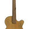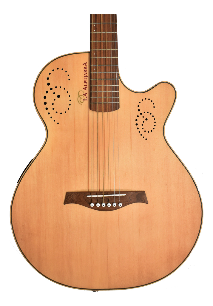 Guitarra ELECTRO ACÚSTICA con corte sin boca. Caja Angosta (5cm). Orificios en los laterales superiores. Fina construcción. Tapa de Pino Abeto seleccionado. Barreado Tipo X. Aros y Fondo de Jacarandá. Delicados filetes en Aros y Fondo de color Blanco. Mástil de Cedro. Diapasón de Jacarandá. Trastes de Alpaca. Clavijero dorado. Lustre natural. FISHMAN INK-400