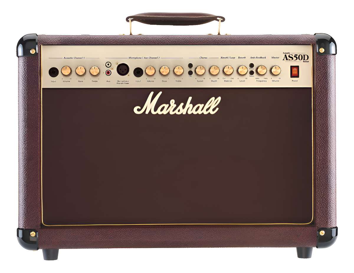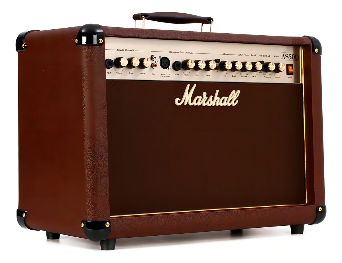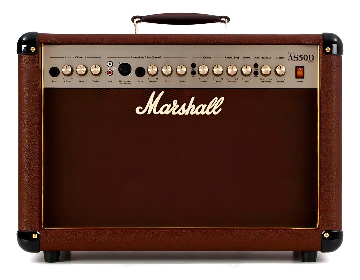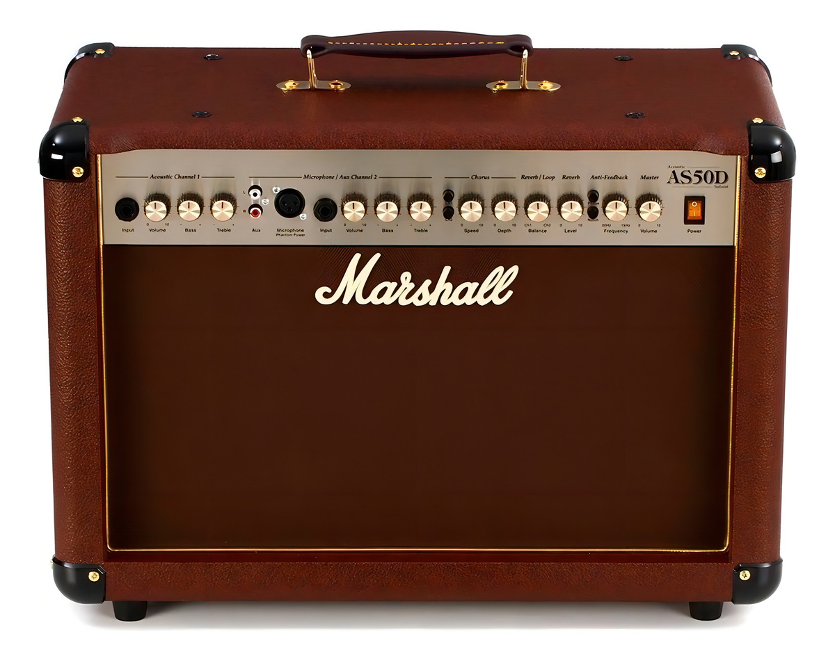 El Marshall AS50D es un amplificador de 50 vatios, Cuenta con 2 parlantes de 8 “con 2 canales, incluyendo un canal de micrófono con alimentación phantom. Cuenta con un tweeter rediseñado, chorus digital y reverb, y un filtro anti-feedback para evitar acolpe. Cada canal cuenta con su propio volumen, Ecualizador, lazo de efectos, y la salida DI. volumen principal, salida de línea y entradas RCA .