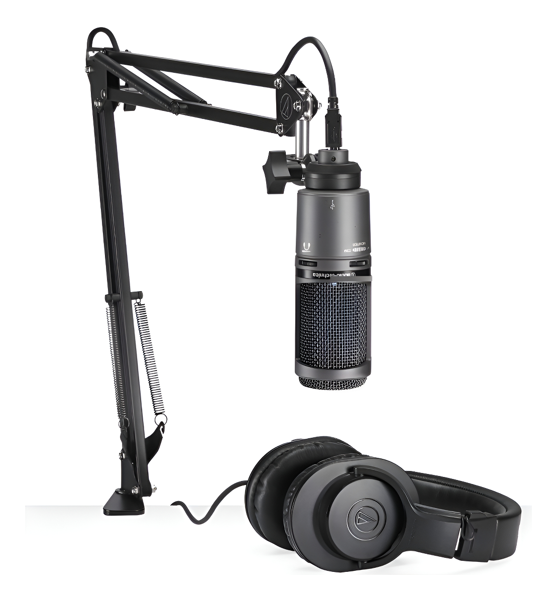 El paquete de micrófono vocal AT2020USB+PK está diseñado para streamers, podcasters, y otros creadores de contenido que necesitan una configuración de micrófono con brazo fácil y de instalar y de ajustar. El paquete incluye un micrófono de condensador cardioide AT2020USB+, un par de audífonos profesionales de monitorización ATH-M20x y un brazo de soporte de estudio roscado con un cable USB.