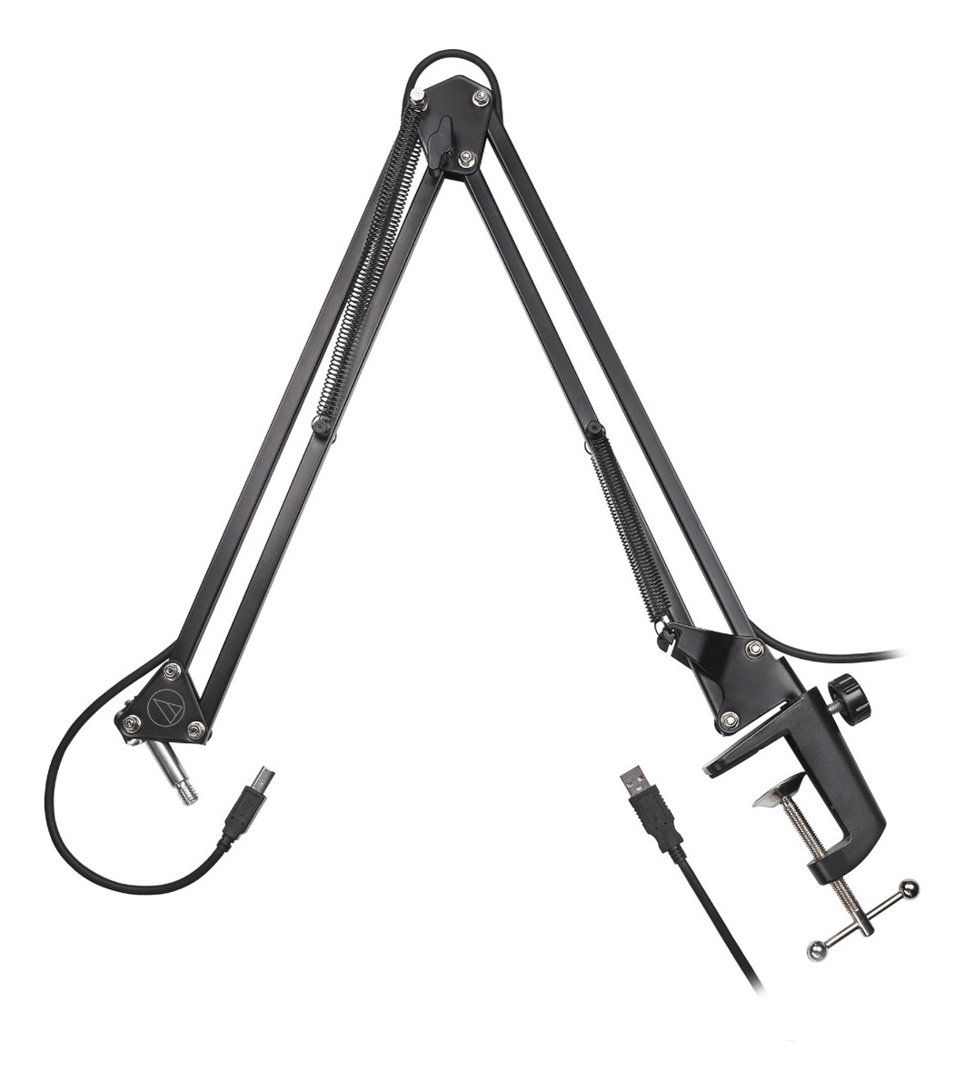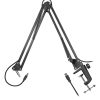 El brazo de soporte de estudio ajustable se monta con seguridad a escritorios, mesas y otras superficies planas de un grosor de hasta 55 mm. El brazo está equipado con una rosca estándar de 5/8″-27 para un fácil ajuste del soporte pivotante para pedestales para micrófono incluido, y el cable USB está roscado internamente para ofrecer un aspecto ordenado y un entorno despejado. Gracias a la capacidad de rotación de 360° y a las bisagras de muelle ajustables, el brazo de soporte se reorienta rápidamente para un colocación óptima del micro.