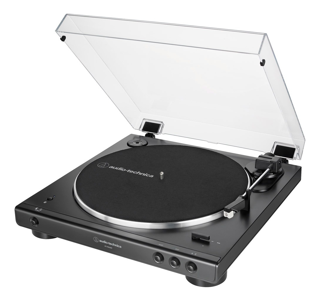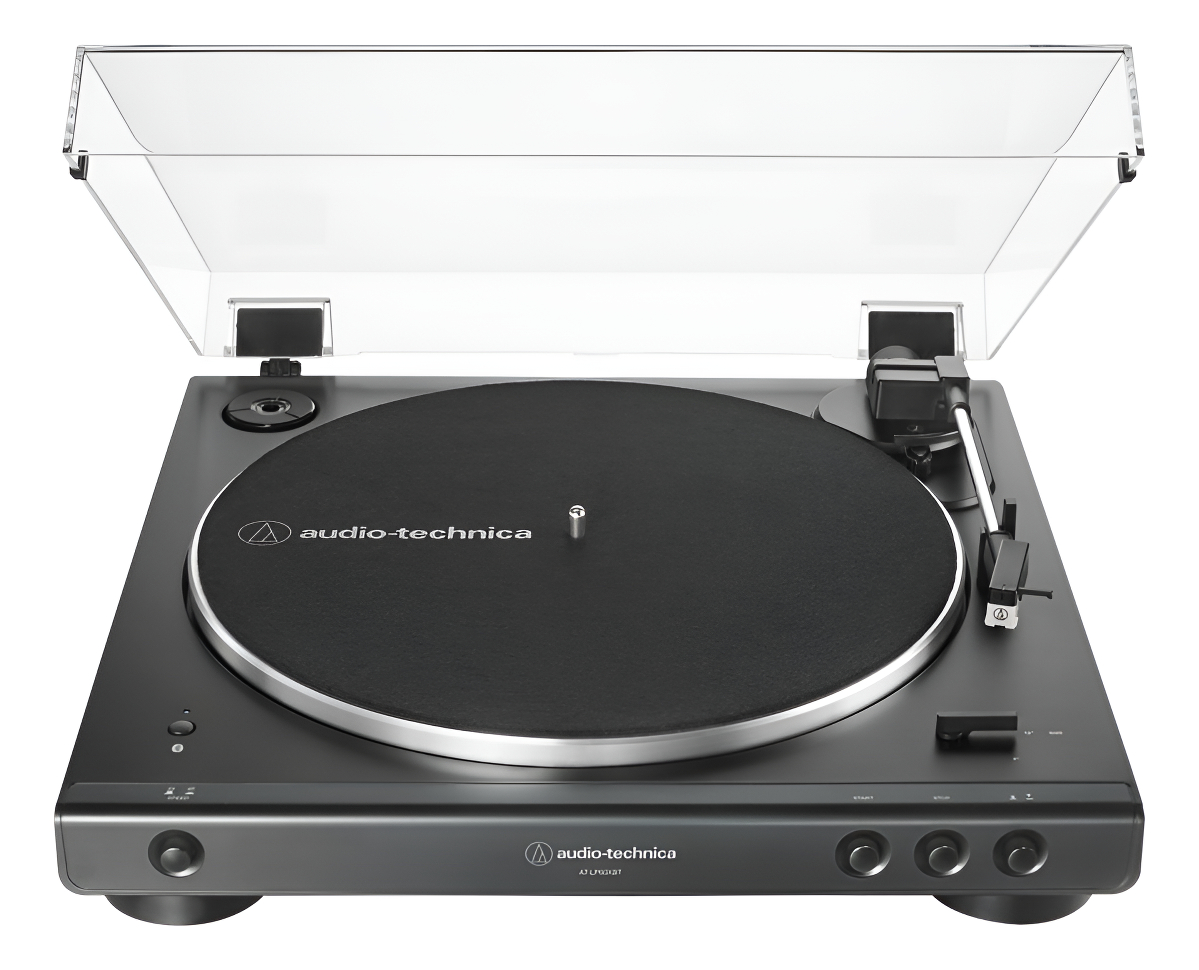 El tocadiscos AT-LP60XBT reproduce discos de 33-1/3 y de 45 rpm y viene con un adaptador de 45 rpm, un cable de salida RCA doble desconectable (para la conexión alámbrica) y una cubierta antipolvo abisagrada desmontable.