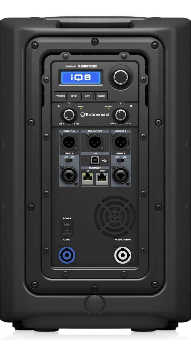 Equipado con un ligero pero eficiente amplificador de potencia Klark Teknik Clase D de 2 canales, el iQ8 ofrece una impresionante potencia de 2500 watts de salida. Un alto grado de control sobre el desempeño del sistema de altavoces se gestiona por un sofisticado procesador Klark Teknik de señal digital (DSP) que proporciona un ecualizador dinámico para una notable respuesta de rango completo a bajos niveles de volumen y una limitante transparente para ofrecer lo último en claridad a niveles altos de salida y una gran fiabilidad a largo plazo. Los avanzados presets de modelado DSP de altavoces incluyen modelos detallados y precisos de algunos de los altavoces más respetados en la industria del audio.