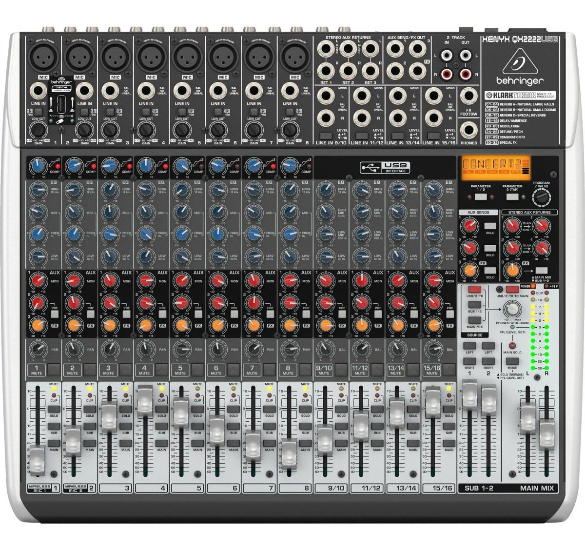 How about eight XENYX mic channels with inserts, dedicated compressors, 3-band EQ with semi-parametric mids and three Aux Sends? You get all of this with the QX2222USB¿plus four stereo line-level channels, two convenient mix subgroups and onboard KLARK TEKNIK 24-bit digital FX processing, with dual user-addressable parameter controls, and our built-in dual-channel ULM wireless mic receiver port. All this and much more in a rugged, roadworthy steel chassis.