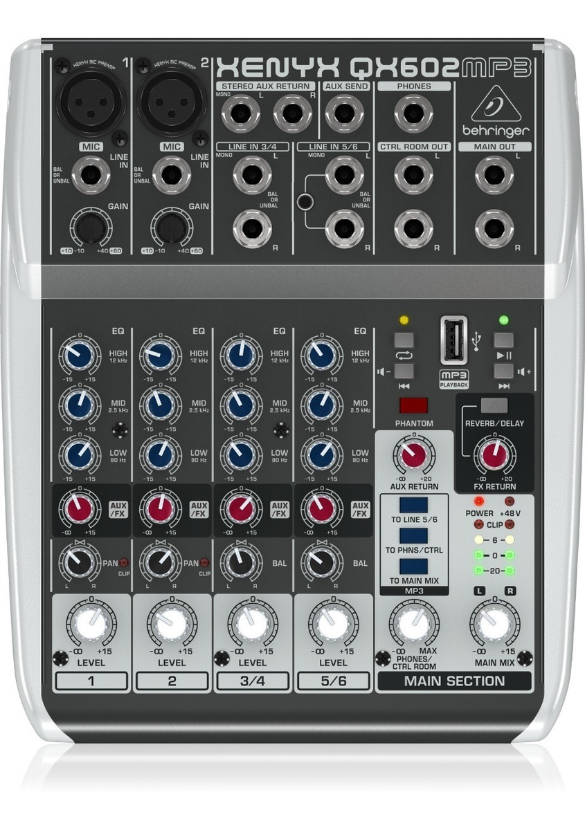 El Xenyx QX602MP3 es un mezclador analógico de 6 entradas y 2 buses con preamplificadores de micrófono Xenyx, ecualizador de 3 bandas de estilo británico y un reproductor de MP3 incorporado. La guinda del pastel; sin embargo, es el procesador Klark Teknik FX integrado que le proporciona reverberaciones y retrasos de gran sonido. Hay un envío de FX por canal, más un FX para controlar la función de sala que le permite monitorear los efectos a través de auriculares y las salidas de la sala de control. En el lado de la salida, el Behringer Xenyx QX602MP3 le ofrece la red eléctrica, además de una sala de control separada y salidas de auriculares. Además de eso, el reproductor de MP3 incorporado le permite acceder a archivos de audio desde una memoria USB.