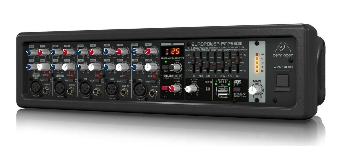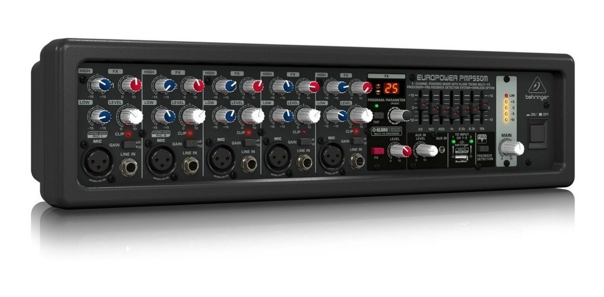 La increíble mezcladora Powered Mixer PMP550M ofrece una potencia tremenda (2 x 250 Watts dual mono), a la vez que mantiene una increíble relación potencia-peso. Estos mezcladores emplean tecnología Clase-D de alta eficiencia y una fuente de alimentación conmutada de última generación, que reduce significativamente el peso y el calor. El PMP550M de 5 canales presenta 5 preamplificadores de micrófono de alta calidad (2 de los cuales también aceptan nuestros micrófonos inalámbricos digitales ULM, disponibles por separado) y una entrada auxiliar de 1/8 “para reproducir música desde sus dispositivos inteligentes. añadió un procesador KLARK TEKNIK de 24 bits Multi-FX con 25 preajustes que incluyen reverberaciones de clase de estudio, retardos, pitch shifter y varios multiefectos, además de un ecualizador gráfico estéreo de 7 bandas con nuestro sistema de detección de realimentación FBQ patentado, para lo último en Rendimiento sin feedback. Show Music, en el barrio de Belgrano, te lo recomienda.