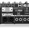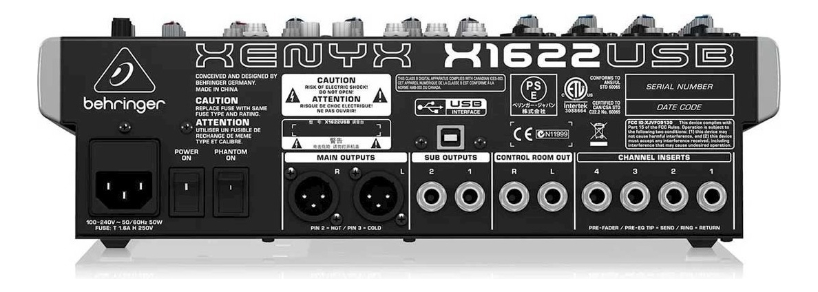 | Conectores | 1 phone TRS 6.3 mm, 4 line TRS L-mono/R 6.3 mm in, 1 footswitch jack 6.3 mm, 1 main TS L/R 6.3 mm out, 1 main XLR L/R out, 1 track RCA L/R in, 1 track RCA L/R out, 2 aux return TRS L-mono/R 6.3 mm, 2 FX send TS 6.3 mm, 4 line TRS 6.3 mm in, 4 mic XLR in |