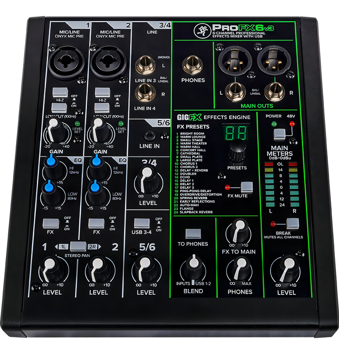 La Mackie Profx6v3 es una consola analógica de alta calidad, diseñada para brindarte un sonido claro y profesional. Además, cuenta con alimentación fantasma, lo que la hace compatible con micrófonos de condensador y otros dispositivos que requieren esta función.