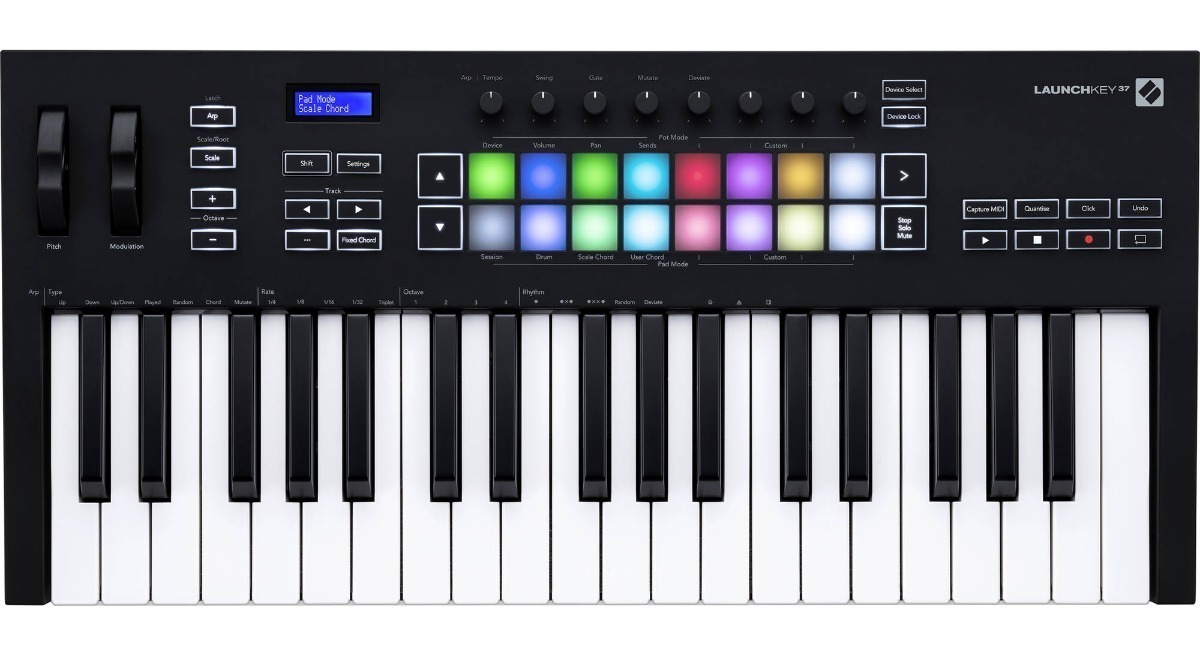 Novation Launchkey 37 MK3 es un controlador de teclado MIDI de 37 teclas intuitivo y totalmente integrado para hacer pistas en Ableton Live y con su equipo externo. La experiencia de Launchkey está diseñada para músicos de todo tipo y habilidad. Con Launchkey 37 MK3, independientemente de la experiencia, puedes crear y reproducir tu música como nunca antes. Con sus diversas funciones de creación musical, todas ellas utilizables de forma autónoma, Launchkey elimina las barreras a la creatividad.