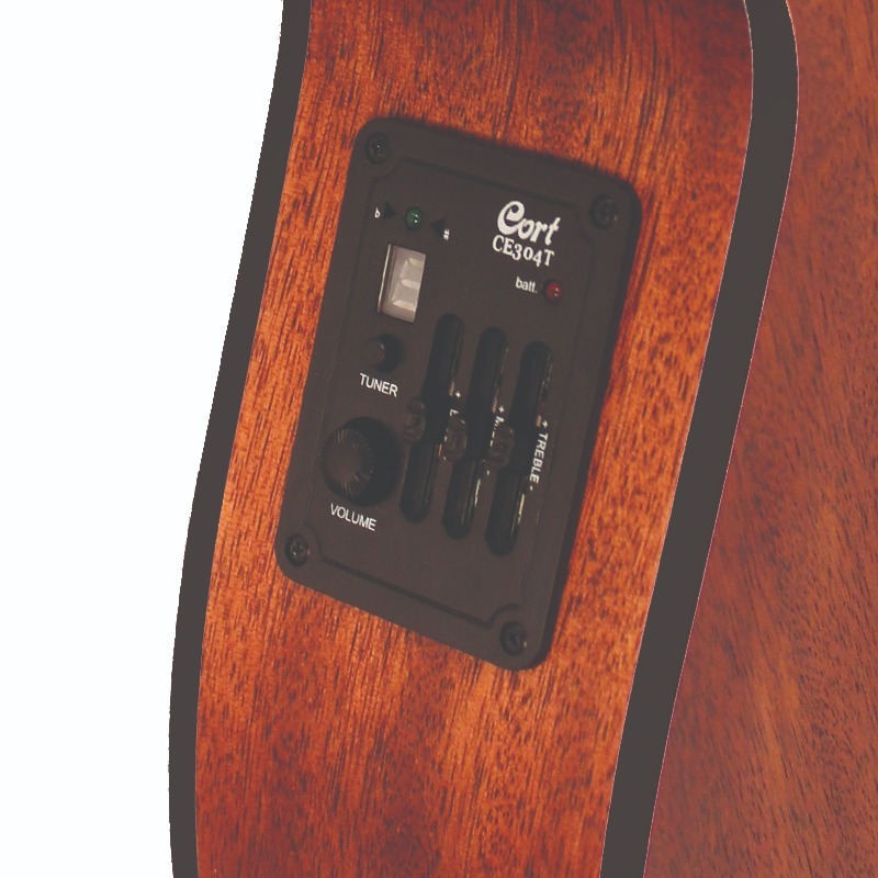CORT CE304T EQ. Incluye un ecualizador de 3 bandas para flexibilidad tonal y un sintonizador de LED incorporado para mayor comodidad. Este sistema EQ de alto valor ofrece un rango medio rico con altos transparentes transparentes.