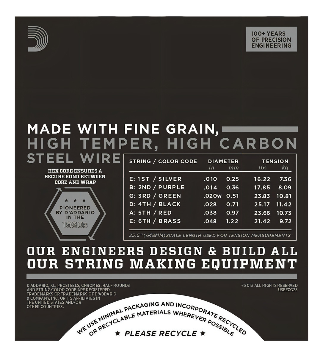 El paquete incluye cuerdas de acero liso .010, .014 y entorchado en níquel .020, .028, .038, .048, diseñadas para mantener su frescura gracias a un empaque ecológico y resistente a la corrosión. Fabricadas en Estados Unidos.