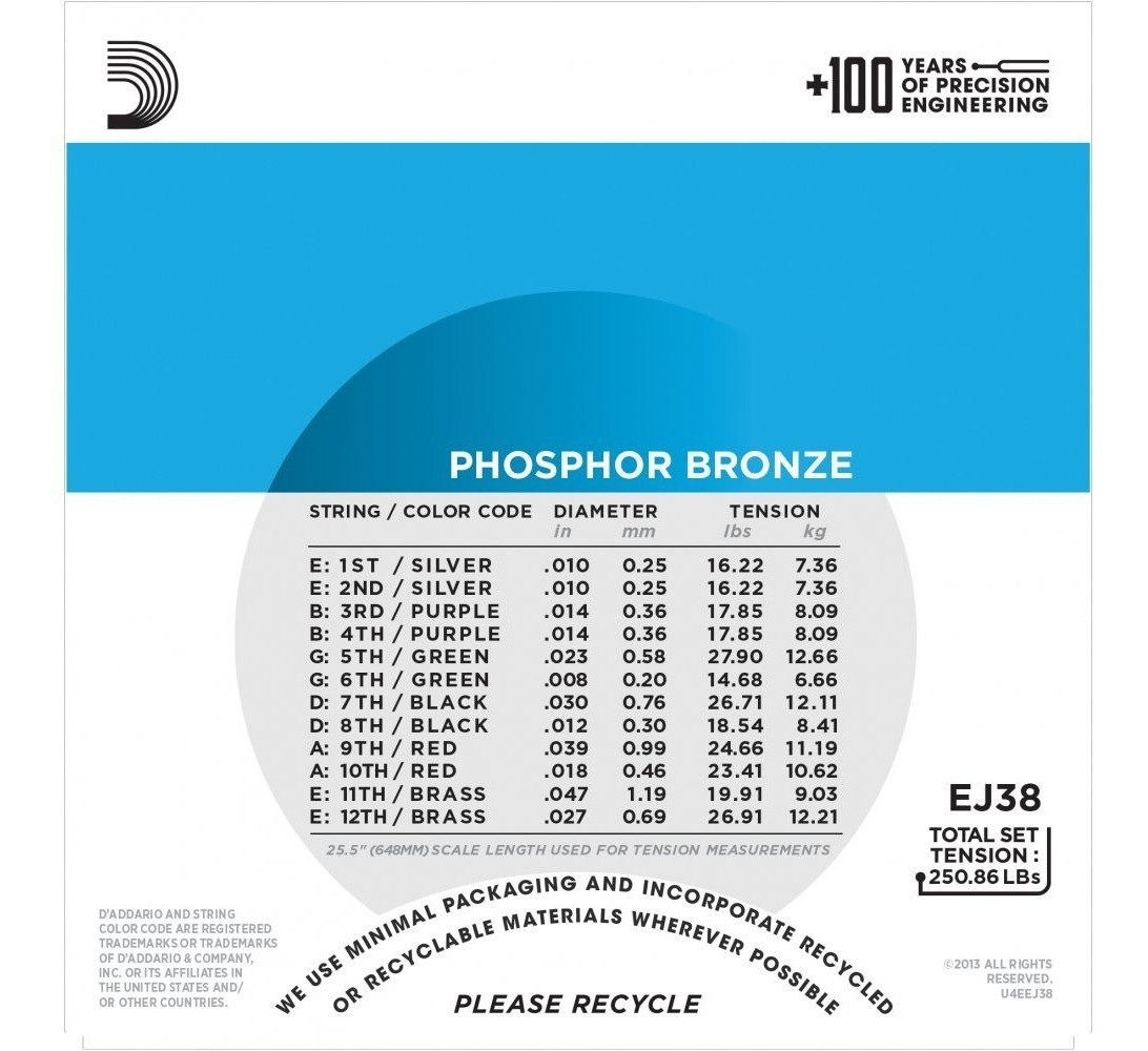 El encordado ofrece el equilibrio ideal de volumen, proyección y comodidad de uso, diseñado para todas las marcas y modelos de guitarras acústicas de 12 cuerdas. El bronce fosforado, introducido en la fabricación de cuerdas por D’Addario en 1974, se ha convertido en un sinónimo de calidez, nitidez y tono acústico bien equilibrado. Estas cuerdas poseen un entorchado de precisión con bronce fosforado resistente a la corrosión sobre una cuerda de acero de alto carbono, con forma hexagonal y estirada cuidadosamente, resultando en un tono brillante y duradero con excelente entonación.