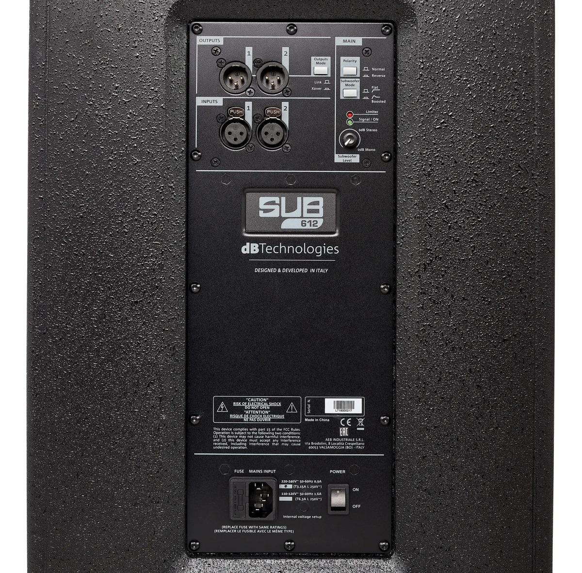 Al igual que los modelos de 15” y 18” de esta familia, el SUB 612 bass-reflex incorpora un amplificador de 600W RMS Clase D con SMPS, ofrece un nivel de presión acústica extraordinario (hasta 129 dB) a pesar de su compacto alojamiento (solo 19,8 kg – 43,65 lbs) y proporciona una reproducción muy precisa.