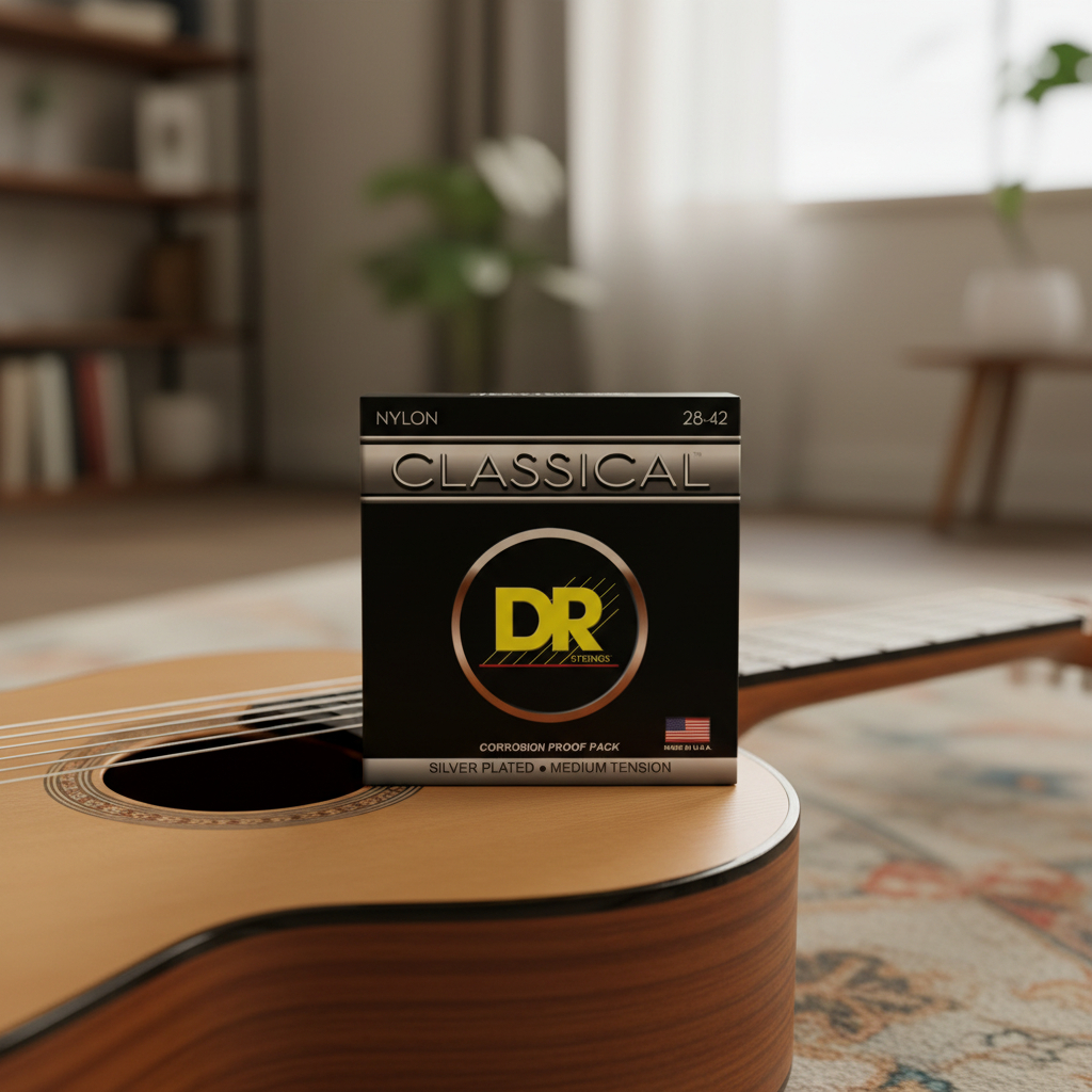 Las cuerdas clásicas de nailon de DR proporcionan agudos brillantes y claros con graves profundos y contundentes, el complemento perfecto para tocar la guitarra clásica. Las cuerdas agudas están hechas de nylon de alta densidad y las cuerdas graves cuentan con bobinados de cobre plateado para lograr un excelente tono, proyección y sensación.
