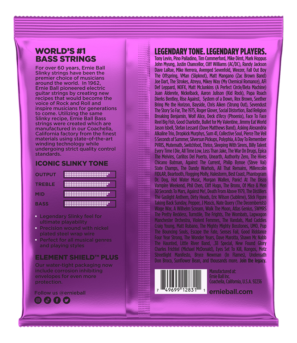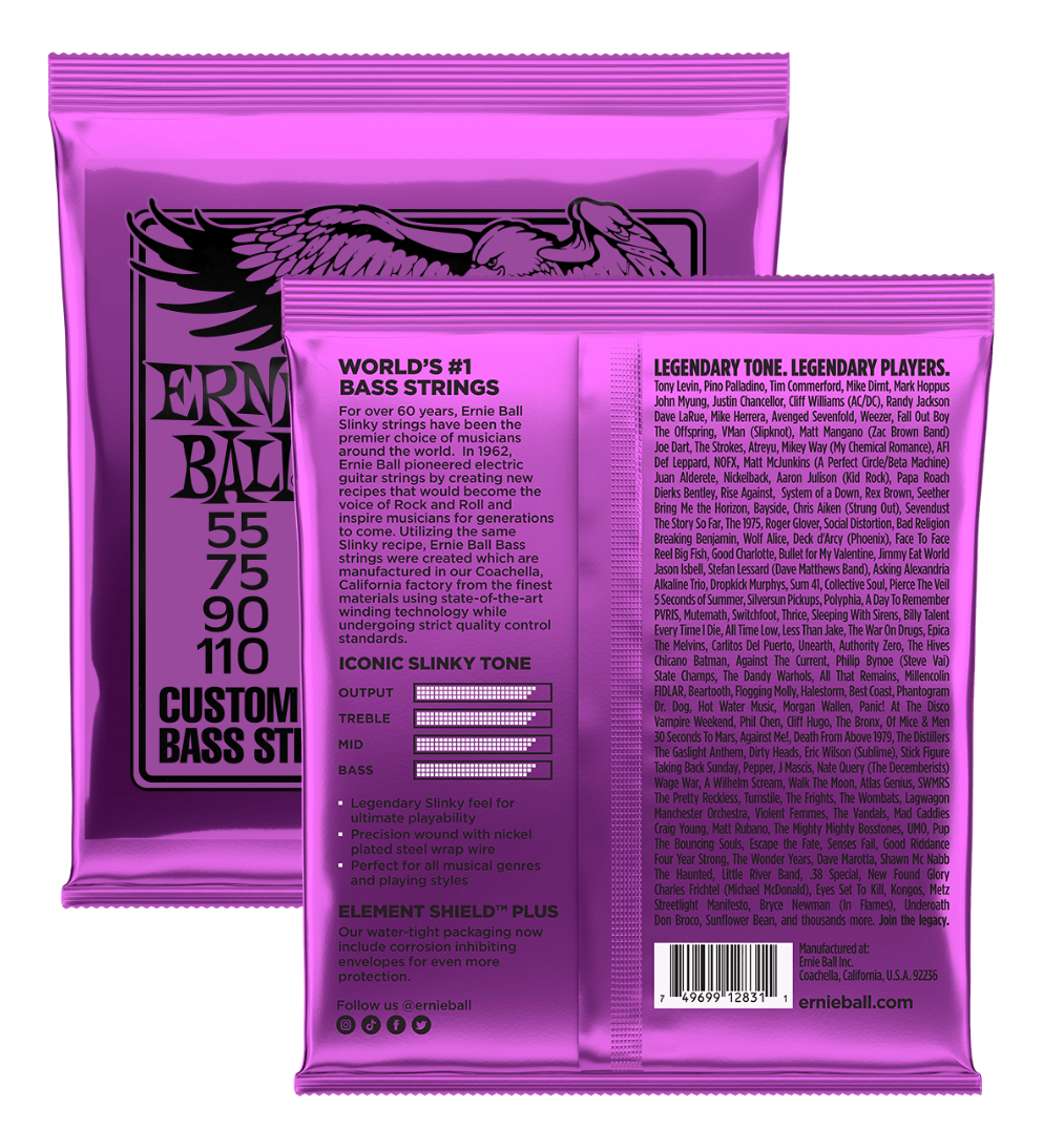 Las cuerdas Ernie Ball Slinky para bajo ofrecen una respuesta brillante y un tono equilibrado. Cada cuerda se fabrica minuciosamente con materiales de alta calidad en la factoría de Coachella Valley, en el sur de California. La lista de endorsers de las cuerdas Slinky, nos da una idea de su rendimiento. Cuerdas .055, .075, .090, .110