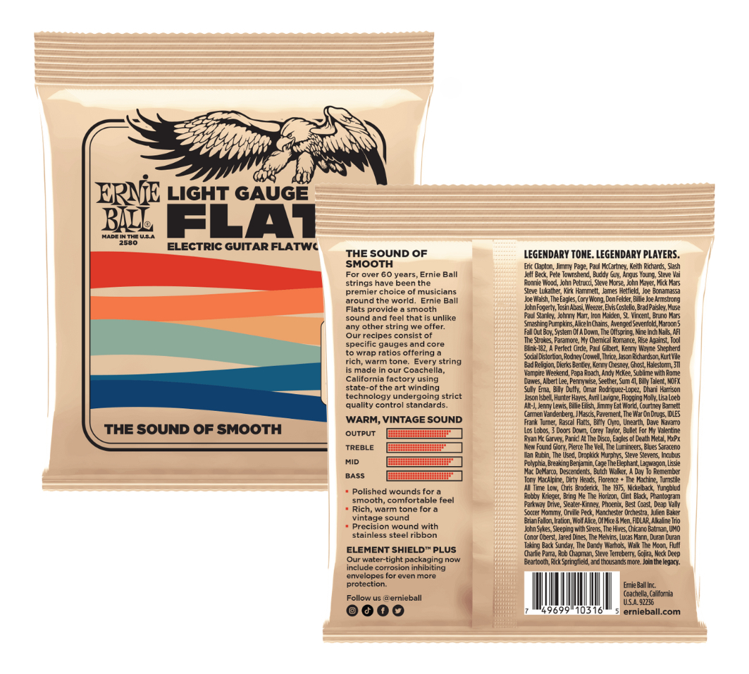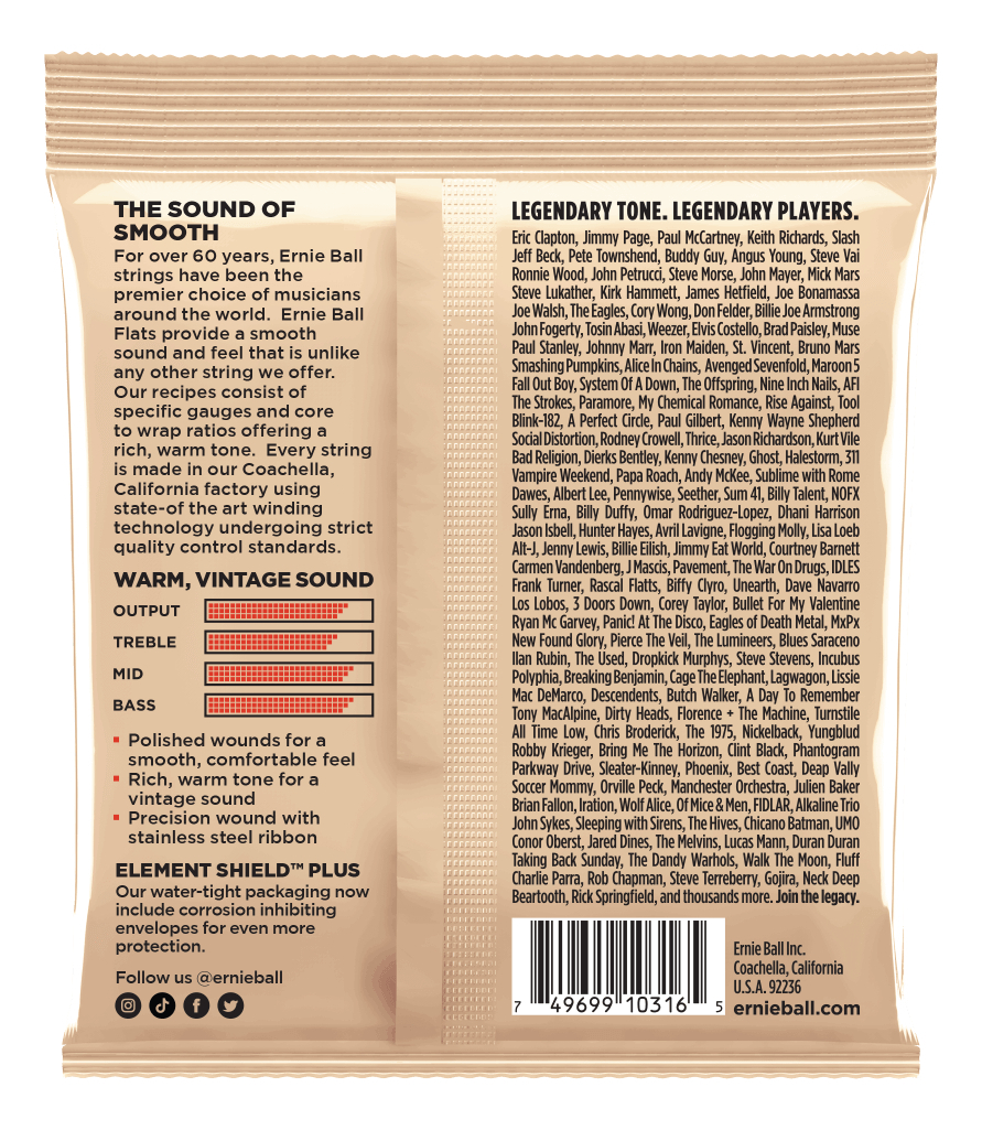 Las cuerdas de guitarra Ernie Ball Stainless Steel Flatwound son el complemento perfecto para los músicos buscando un tono cálido, meloso y una sensación vintage suave. Las cuerdas entorchadas están construidas con núcleos hexagonales de acero enchapado en estaño, con una envoltura de cinta de acero inoxidable que ha sido pulida hasta lograr un acabado suave como el vidrio. El sonido resultante está inspirado en la antigüedad, con una fundamental oscura, suave. Debido a la superficie plana pulida, el ruido inherente a los dedos de las cuerdas tradicionales es virtualmente eliminado, haciendo estas cuerdas las favoritas entre los músicos de Jazz y artistas que sesionan en grabaciones por igual.