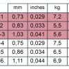 1E 0.73, 2B 0.83, 3G 1.03, 4D 0.75, 5A 0.86, 6E 1.11, milímetros
