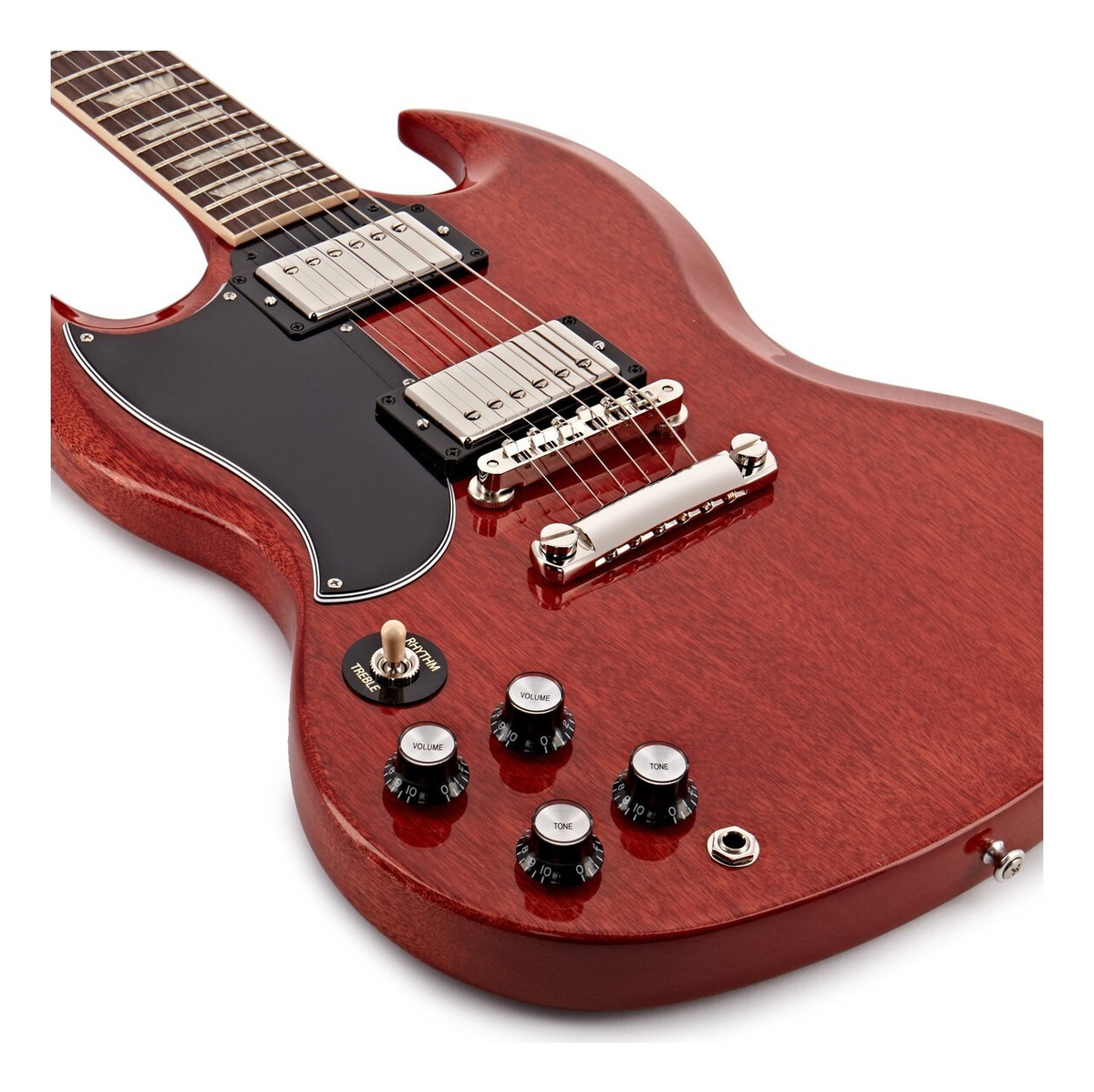 Detalles de Autenticidad: La Gibson SG Standard ’61 se enorgullece de conservar toda la esencia de la original. El golpeador en forma de lágrima de 5 capas y la unión del mástil en el traste 22 son detalles que hacen eco del diseño clásico. Estos elementos no solo mejoran la estética de la guitarra, sino que también influyen en su sonido y rendimiento.