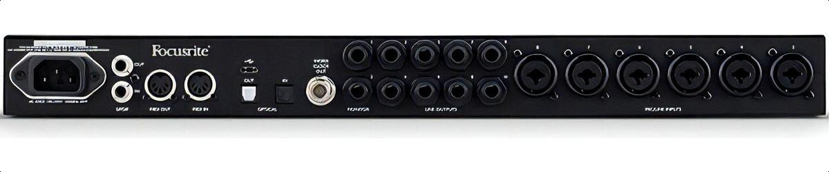 1 SPDIF óptico in, 1 SPDIF óptico out, 2 phone TRS 6.3 mm, 1 MIDI in, 1 MIDI out, 1 SPDIF RCA in, 1 SPDIF RCA out, 1 thunderbolt, 1 word clock out, 2 monitor jack 6.3 mm out, 8 combo XLR/TRS-TS 6.3 mm in, 8 line TRS-TS 6.3 mm out