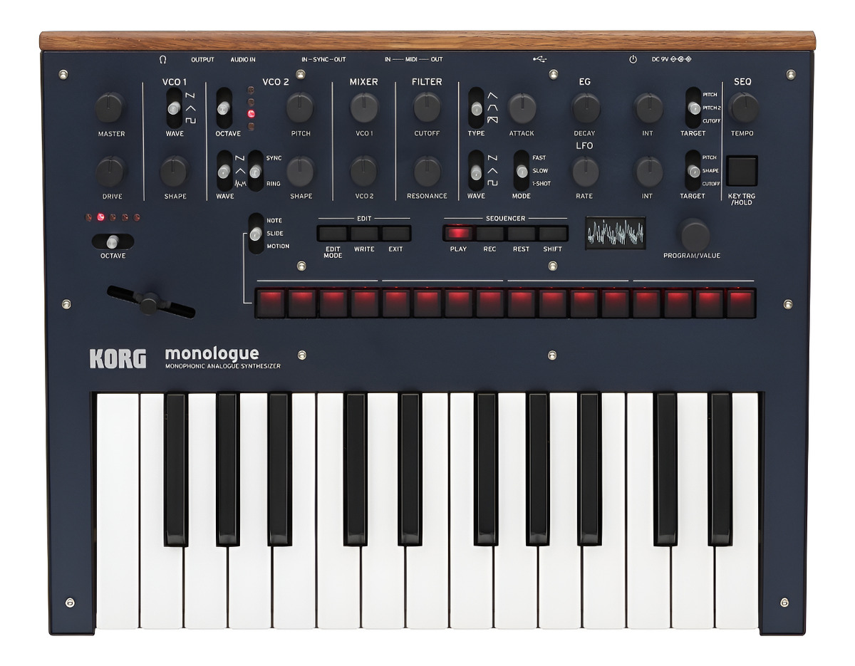 La sección de teclado cuenta con el aclamado teclado slim de minilogue y MS-20 mini. Para hacer del monologue un sintetizador que cualquier músico pueda llevar y tocar inmediatamente, el teclado cubre el rango de notas E¿E, igual que una guitarra o un bajo.