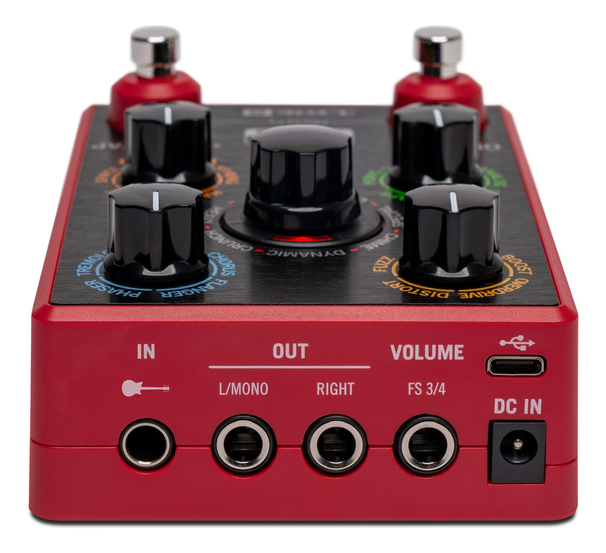 Las características adicionales incluyen salidas estéreo, tap tempo, un sintonizador, una puerta de ruido, una salida de auriculares y una interfaz de audio USB-C con capacidades de reamplificación. Agregue un pedal de expresión opcional para controlar el volumen o hasta dos footswitchs para seleccionar ajustes preestablecidos o activar y desactivar efectos.
