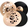 El set está compuesto por un Crash de 12”, un Ride de 12” y unos Hats de 12”. El Crash DJs 45 de 12” es un platillo rápido y explosivo con una efervescencia sucia para los acentos cortos y rápidos. Los Hats DJs 45 de 12” ofrecen un sonido de palo distintivamente seco, un sonido abierto con un siseo de thrash silenciado y un chik que es un estupendo aplauso seco. El Ride DJs 45 de 12” tiene una distintiva campana completa; también ofrece un pique seco, tipo campana y acentos con bordes enérgicos. Los platillos Crash y el Hat superior traen el característico patrón de agujeros PST X. A pesar de su tamaño, todos los modelos ofrecen un amplio volumen y proyección.