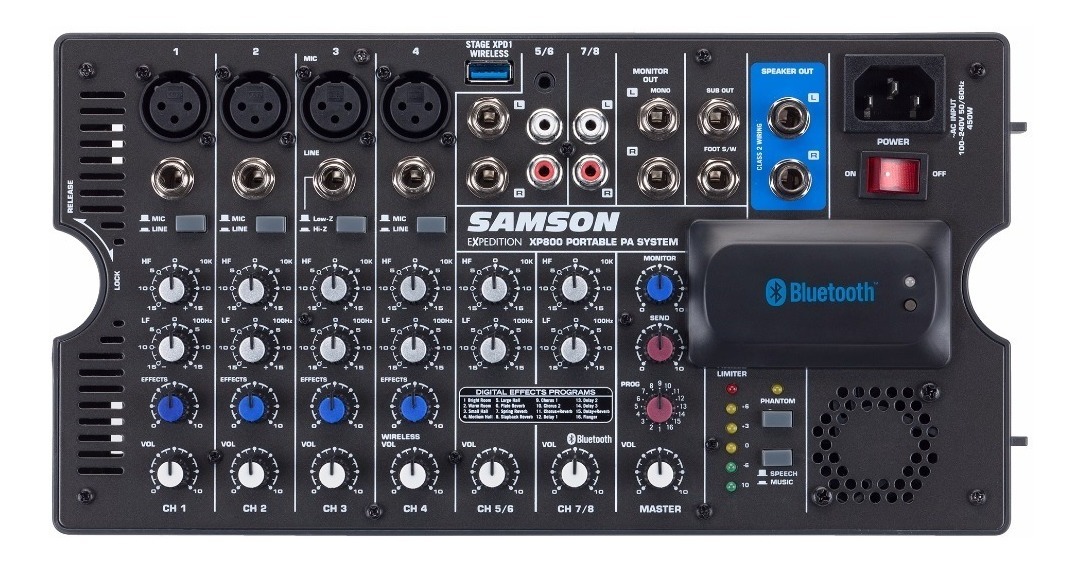 El mezclador del XP800 tiene una variedad de opciones de entrada, incluida la transmisión de audio por Bluetooth, 4 XLR y entradas de 1/4 “mic / line, y entradas estéreo de 1/4”, 1/8 “y RCA. Cada canal tiene un bajo independiente y control de agudos para dar forma al tono, así como efectos incorporados de 24 bits con una selección de 16 preajustes. El XP800 se envía con un cable de alimentación y dos cables de altavoz de 25 ‘.