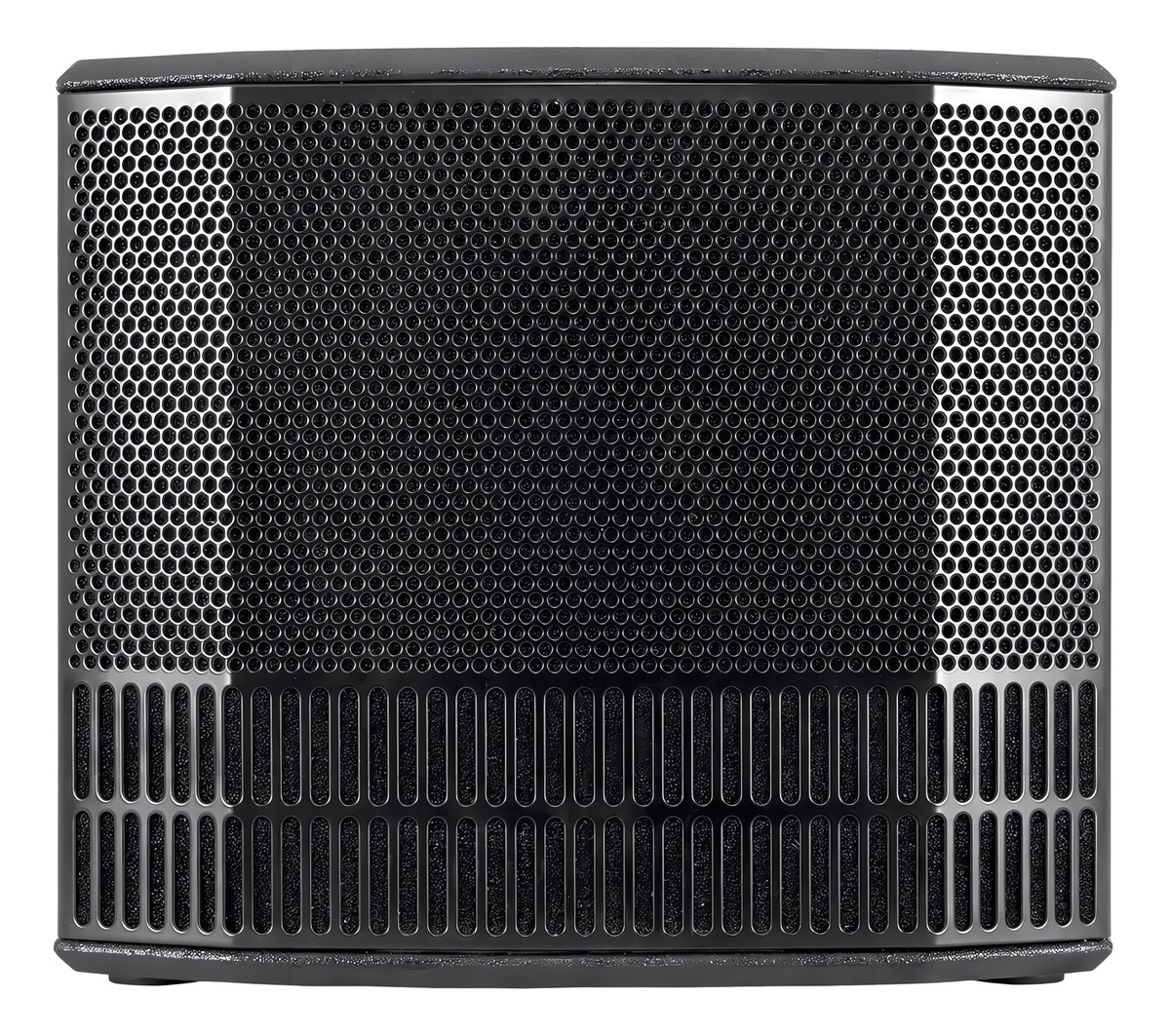 El bass-reflex acoge un generoso woofer de 12” y el módulo amplificador. Además de las conexiones de entrada, hay dos salidas Speakon y una conexión de alimentación VDE. La caja, robusta y estilosa, está fabricada en contrachapado de abedul cubierto por una duradera capa negra resistente a los arañazos, lo que la hace resistente al desgaste de las giras. Dos asas integradas (una por cada lado) facilitan el transporte. Por último, la rejilla metálica con espuma, además de proteger el woofer y dar una imagen profesional y elegante, contribuye al efecto réflex. La parte baja de la rejilla, situada a la derecha de los puertos réflex, tiene de hecho orificios con un mayor diámetro para potenciar el flujo de aire.