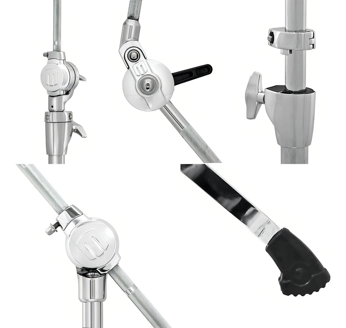 El soporte para platillos Pearl B-1000 Boom está equipado con un volteador Uni-Lock con un poste para cencerro incorporado, coronado con una taza de platillos reversible que se puede usar para controlar el rango de movimiento de platillos. Una tuerca de liberación rápida hace que los platillos cambien súper rápido, mientras que un nuevo inclina- dor de pluma con bloqueo de detención de forma proporciona ángulos confiables. El soporte para platillos B-1000 tiene una junta de tubería fundida usando un casquillo de nylon que evita el ruido no deseado del contacto de metal con metal dentro del tubo y las patas paralelas de doble brazo mantienen todo plantado de forma segura a través de los nuevos pies de goma que absorben las vibraciones.