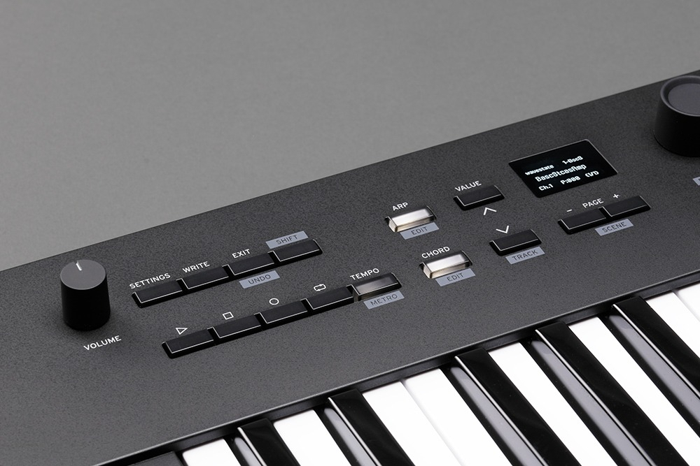 Botón VOLUME, botón SETTINGS, botón WRITE, botón EXIT, botón SHIFT, botón ARP, botón CHORD, botones VALUE ^/, dial VALUE, botones PAGE -/+, botones de transporte, botón TEMPO, Botones OCTAVE -/+.