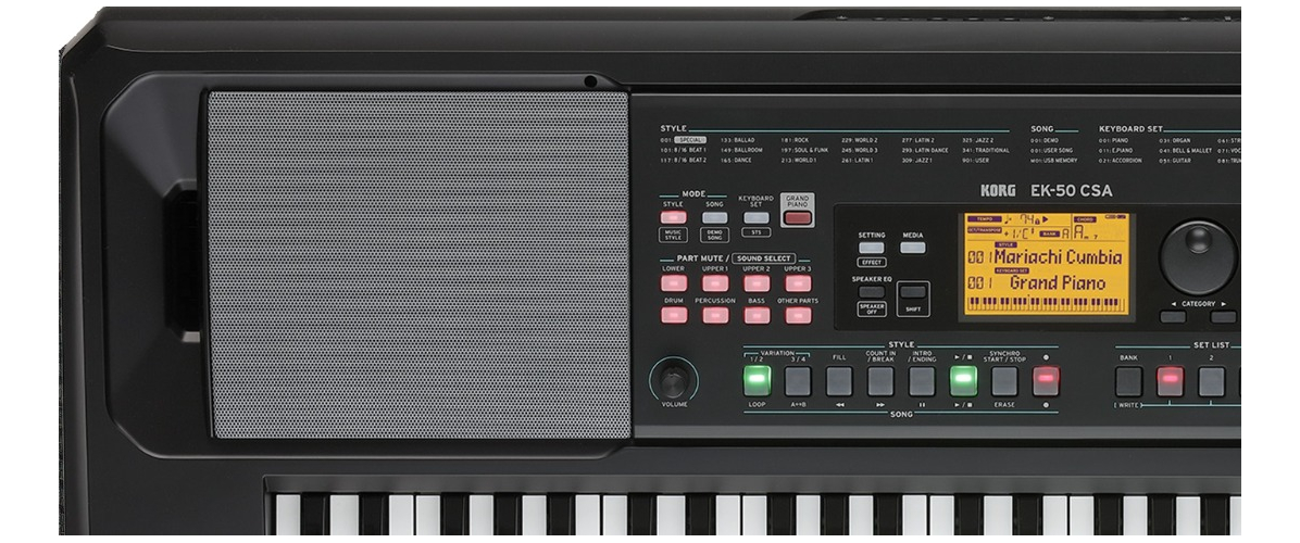 El EK-50 CSA incluye 686 instrumentos, 160 configuraciones de teclado y 356 estilos musicales auténticos que capturan la esencia de la música latina, desarrollados por un equipo de músicos y programadores latinoamericanos de gran talento. Muchos de los estilos del EK-50 CSA han sido rehechos para aprovechar los nuevos e inspiradores sonidos. Los nuevos sonidos de saxofón y metales se pueden oír en categorías de estilos como salsa y merengue, y sonidos especializados como la quena se pueden oír en estilos como la cumbia andina. Esto permite al EK-50 CSA crear la más amplia variedad de géneros musicales latinos, entre los que se incluyen cumbia, reguetón, mariachi, merengue, ska y muchos más. Además de los nuevos estilos latinos, el EK-50 CSA también incluye la amplia gama de estilos y sonidos internacionales del EK-50 original, lo que le permite cubrir un amplio espectro musical.