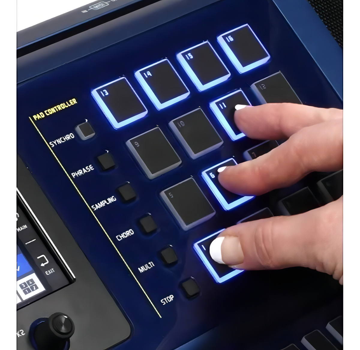El sampleado de alta calidad está habilitado a 44,1 kHz a través del terminal LINE IN o MIC IN. Los usuarios pueden asignar sonidos a los pulsadores como muestras de audio. Varios sonidos de percusión se han sampleado e incorporado como preajustes de tono pulsador y 16 pulsadores de respuesta táctil se pueden utilizar para agregar arreglos de percusión a las interpretaciones de teclado.