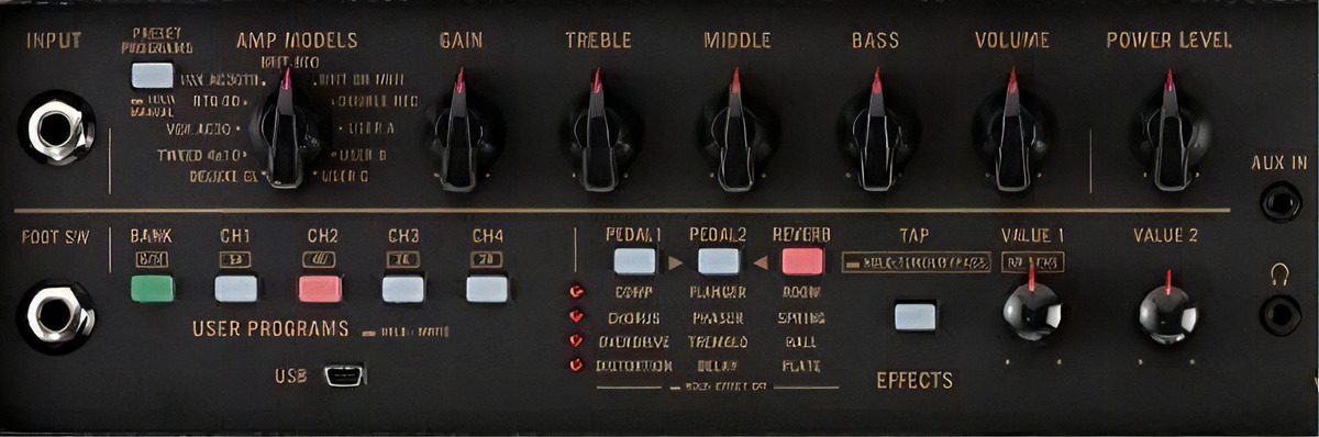 | Conectores de entrada | USB, Aux jack, Footswitch jack, Normal jack |